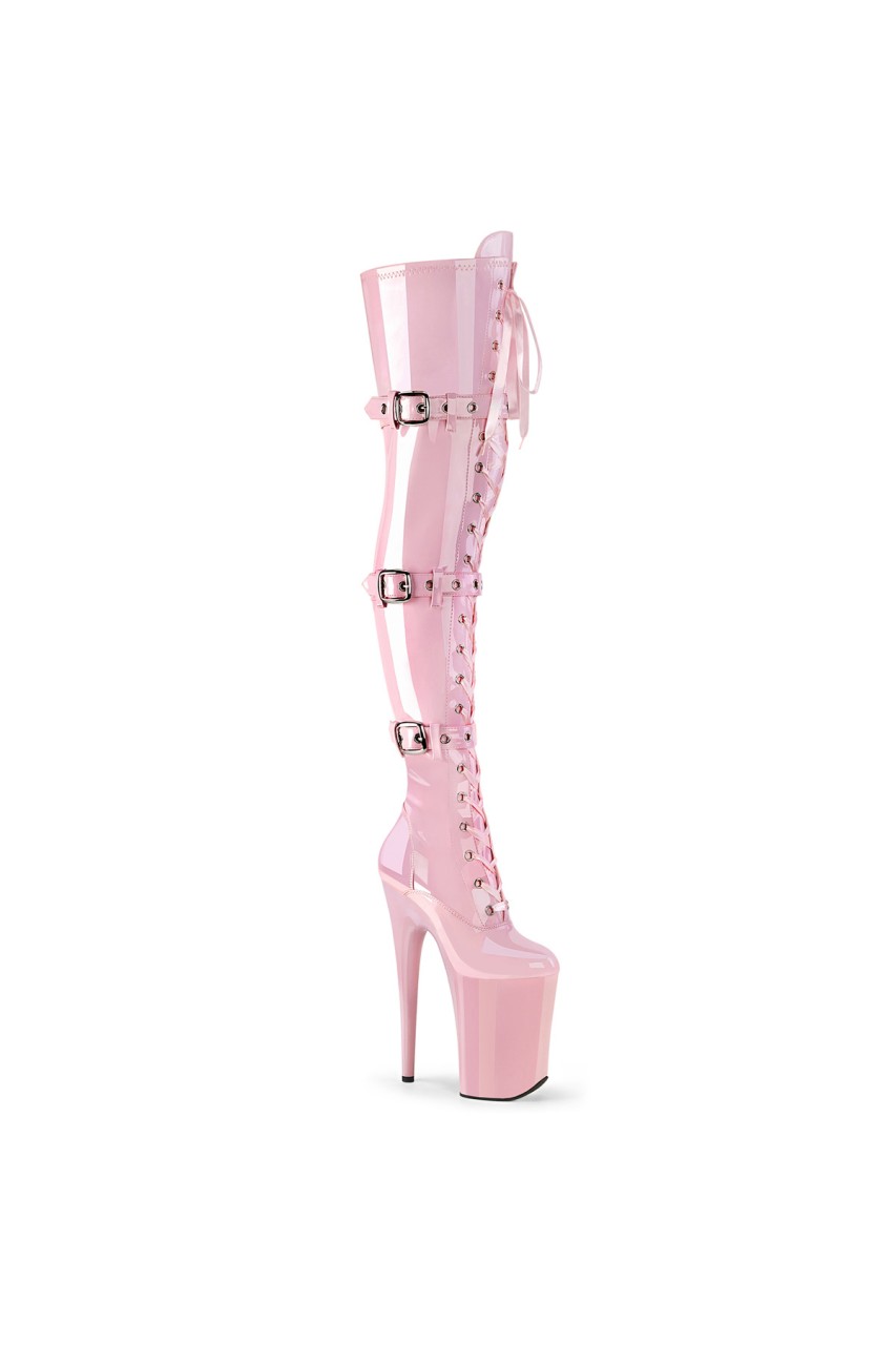 The Pleaser INFINITY-3028 is a stunning pair of thigh-high boots designed to make a statement. These boots feature a vibrant and bold bubblegum pink striped patent material, creating a striking look that demands attention. The stretch material ensures a comfortable and form-fitting fit, hugging your legs in all the right places. With a lace-up front and a full-length side zipper, these boots are not only stylish but also easy to put on and take off. The towering stiletto heel and platform sole add height and allure, while the black sole complements the vibrant pink upper. Whether you're heading to a party, club, or special event, these B. Pink Str Pat boots are sure to turn heads and make you feel confident and fabulous.